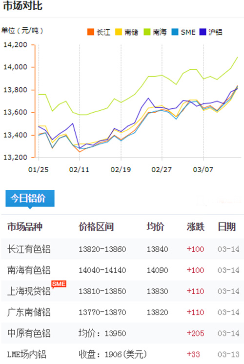 鋁錠價格今日鋁價2019-03-14