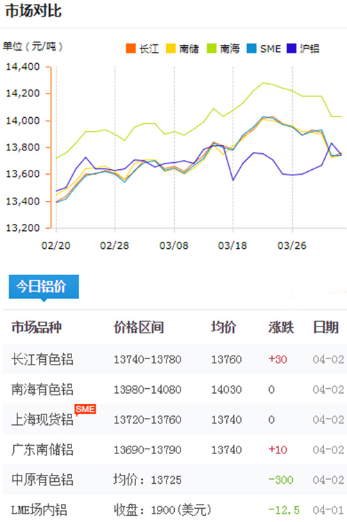 鋁錠價格今日鋁價2019-04-02