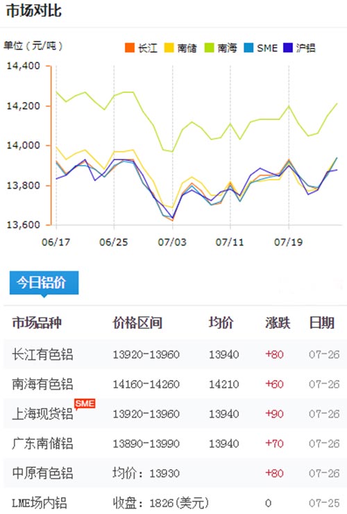 鋁錠價格今日鋁價2019-07-26